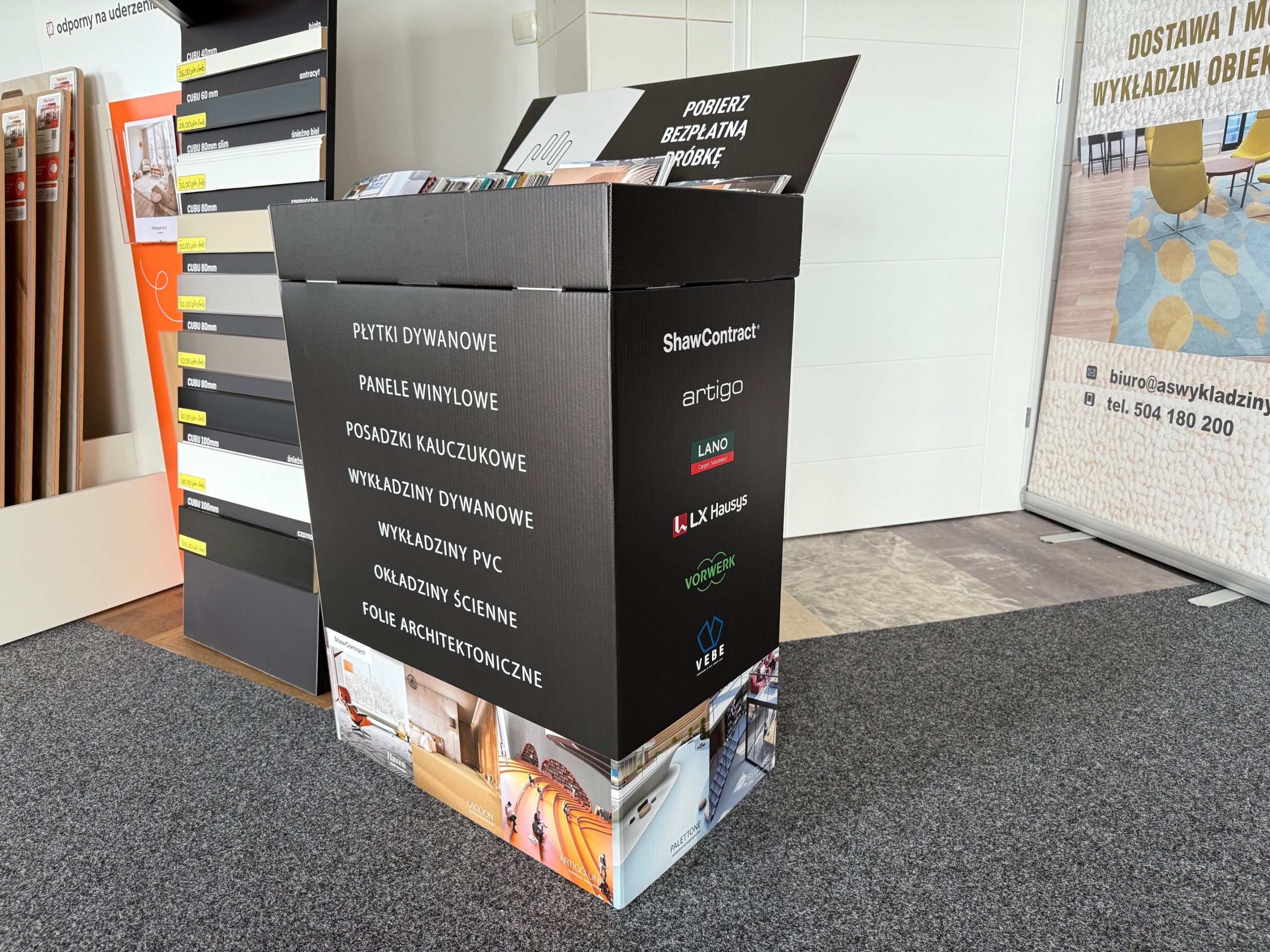 Oferujemy bezpłatne próbki wykładzin, które możesz odebrać stacjonarnie w punktach naszych partnerów w całej Polsce. To szybkie, wygodne i całkowicie darmowe rozwiązanie, bez konieczności składania zamówienia online czy czekania na przesyłkę.