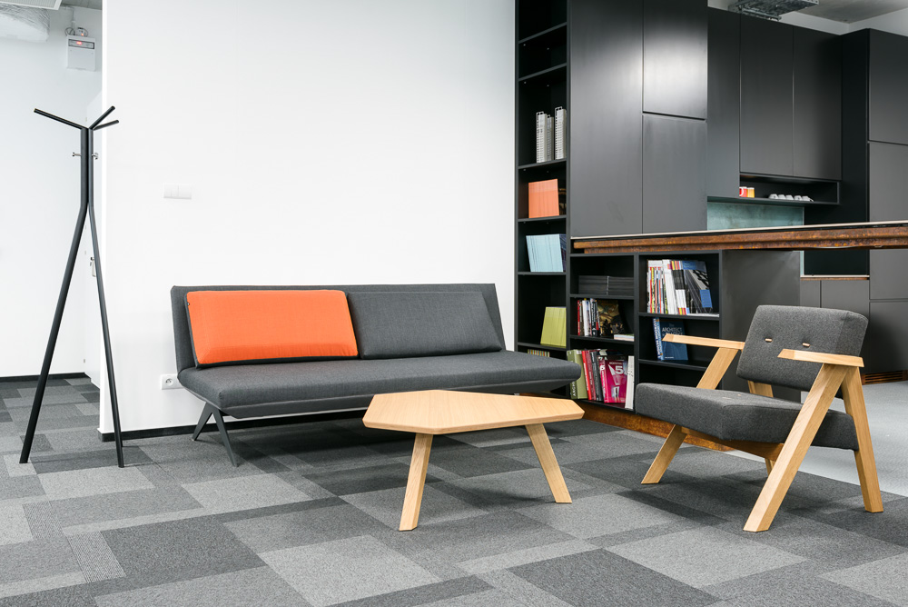 Wykładzina, będąca kluczowym elementem aranżacji podłóg, doskonale komponuje się z technologicznym charakterem firmy, tworząc spójny i profesjonalny wizerunek przestrzeni. Jej szare odcienie nie tylko odzwierciedlają współczesne trendy w projektowaniu biur, ale także sprzyjają skupieniu i nie rozpraszają uwagi pracowników. Ponadto, struktura wykładziny jest zaprojektowana tak, aby wspomagać akustykę pomieszczeń, co jest szczególnie ważne w otwartych przestrzeniach biurowych.